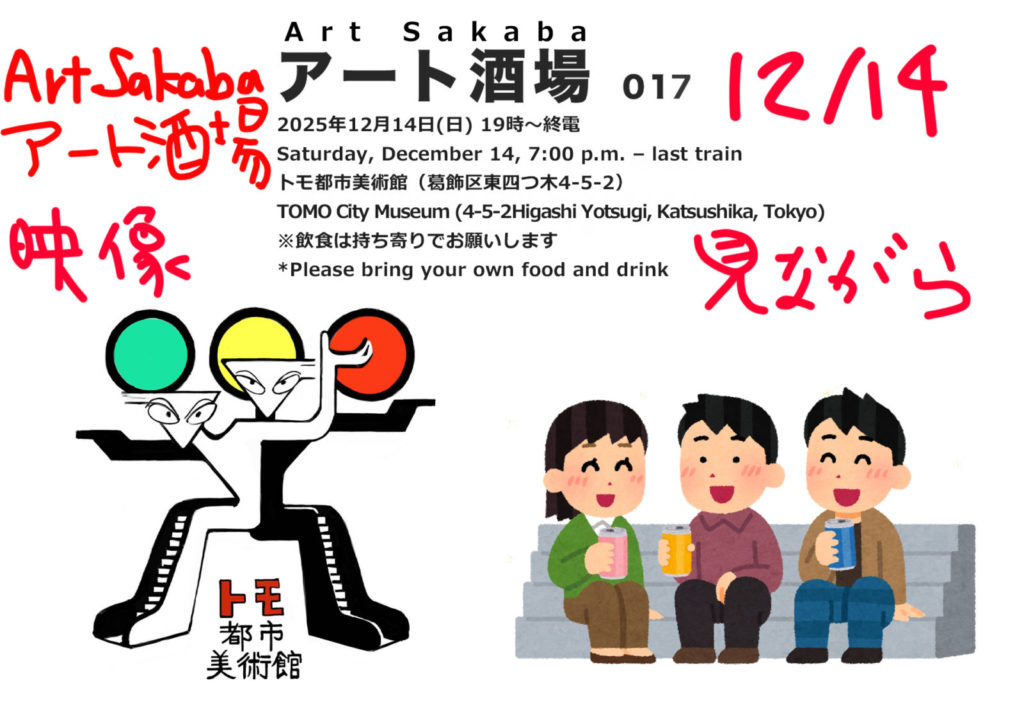On Sunday, December 14, TOMO City Museum will host “Art Sakaba 017” a drinking party open till 0:00 AM. Since the RAM Association: Research for Arts and Media project—where Tomotosi is continuously involved—will be holding a screening event from the afternoon, we’ll continue in that flow. We’ll watch videos, have some drinks and food, and chat as things unfold. You’re very welcome to just watch and eat, or join the discussions—whatever feels comfortable for you! Tomotosi’s regular show is available there.
