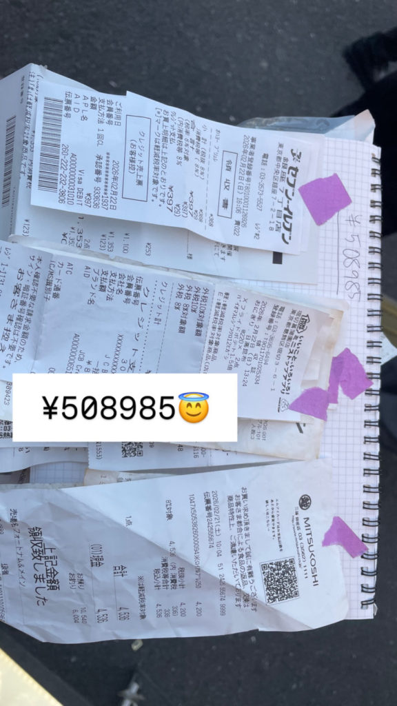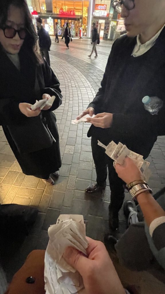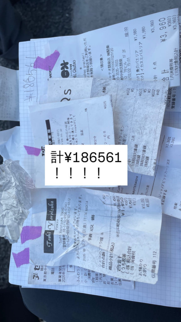 Huge thanks for the insane receipt scavenger hunt! We weren’t sure we’d make it, but the payoff is awesome. Started strong in Ginza (hit 180k in 30 mins!). But backstreets and Newbashi were tough—lots of small receipts, and fatigue set in. The mood almost turned grim. But then, bam! A 220k receipt for orchids! Total game-changer. Shoutout to the mystery buyer! Yurakucho for the final sprint was just a blur of excitement. We nailed it and cleared the target. Final count: 1.09 million yen! Seriously amazing job everyone! (Tomotosi)