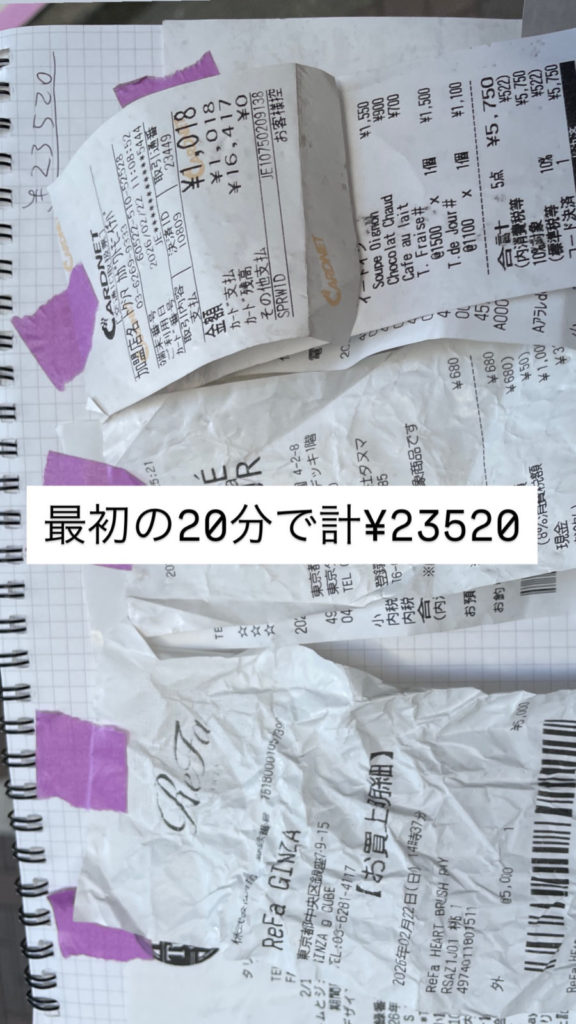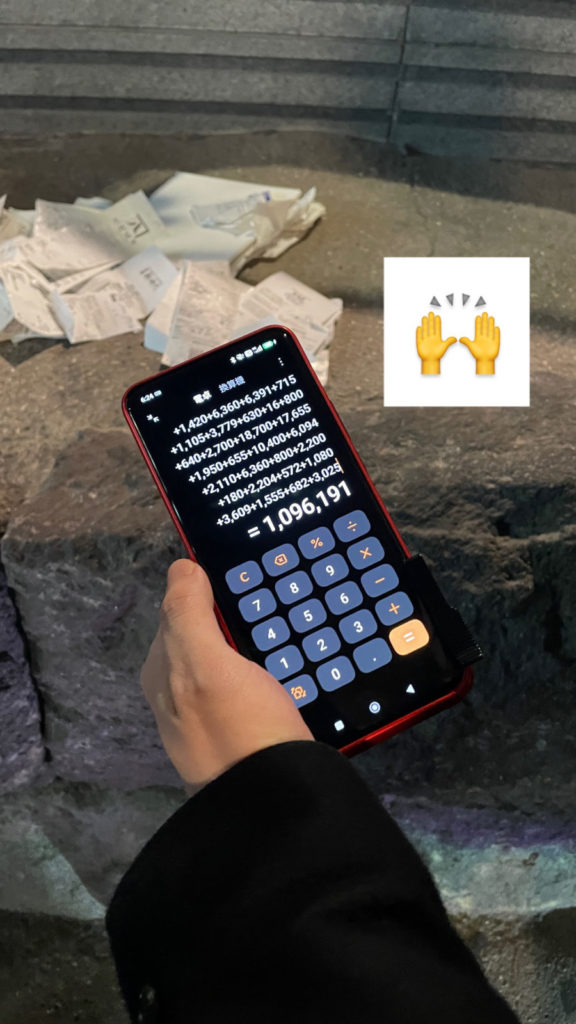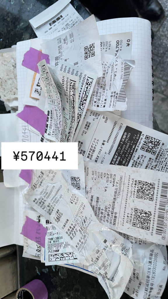 長時間のレシート集めお疲れ様でした!今日中に終わるのかもわからないままのスタートだったけど、終わってみれば達成感すごい。まずは歩行者天国になっている銀座通りを観察しまくって30分くらい集計したら18万円超えてて、ちょっと手応えを感じることができました。ただ大通りを外れると全然レシート落ちてなくて、これ大丈夫か??という空気が流れてきました。ちょっと暗いムードになりかけた時に18万のレシート見つけて盛り上がり新橋の路上は、数は落ちてたけど一個一個の額が小さめでなかなか伸びず。暗さと疲れから、少しだけ諦めの雰囲気も出てきそうな18時頃、なんと22万のレシート発見!誰か知らないけど、胡蝶蘭を買ってレシート捨てた人に感謝。終わりが見えてテンションが戻ってきて、有楽町で最後の仕上げで目標クリア。最後の盛り上がりもあって、一気に終わった!109万円!ほんとお疲れ様でした!(トモトシ)